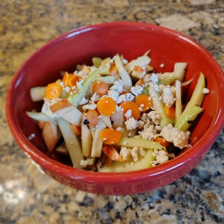 Slice chayote and Honeycrisp apples into thin strips or chop (your preference). Mix with shredded carrots.In jar, combine apple cider vinegar, extra virgin olive oil, horseradish, course ground Dijon mustard, honey, salt and pepper (to taste). Shake vigorously. If you do not have a jar, you can combine in a bowl and mix with a whisk or fork.