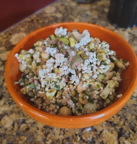 Boil pasta. Don’t over cook, keep firm. Rinse with cold water. Set aside to cool. Heat skillet spray with cooking spray. Char corn, poblano, garlic, salt, pepper & cumin. Remove from heat and cool. In small bowl whisk oil, lime juice and water. Toss veggies and pasta together. Stir in dressing and refrigerate. Stir occasionally. Careful not to crush pasta.