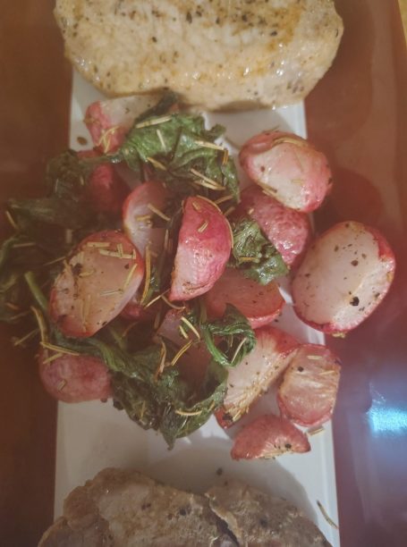 5.After 20 minutes of roasting, carefully remove pan from oven. Add greens to baking sheet and toss to combine. Roast until greens wilt and radishes are tender, about 5 minutes longer. Drizzle with lemon juice.